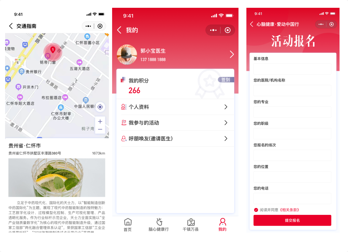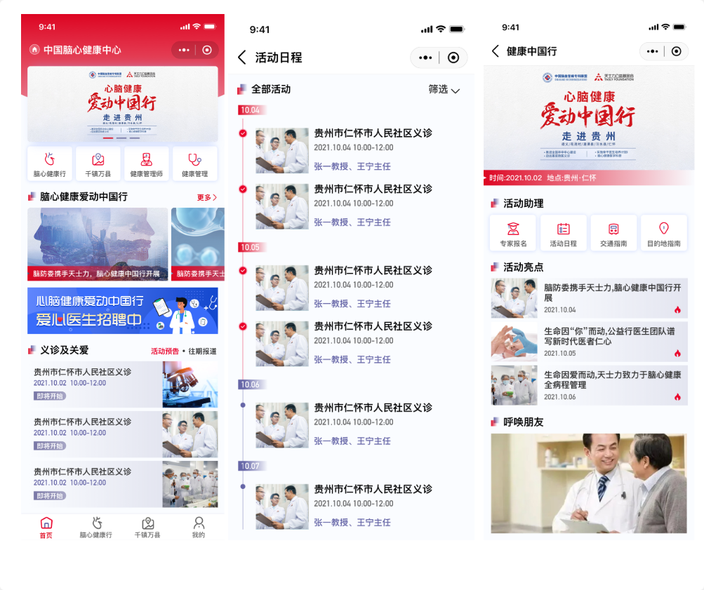 我的:该模块包括首页、个人资料、我参与的活动和邀请医生等功能,用户可以查看个人信息、管理参与的活动,并邀请医生参与活动。