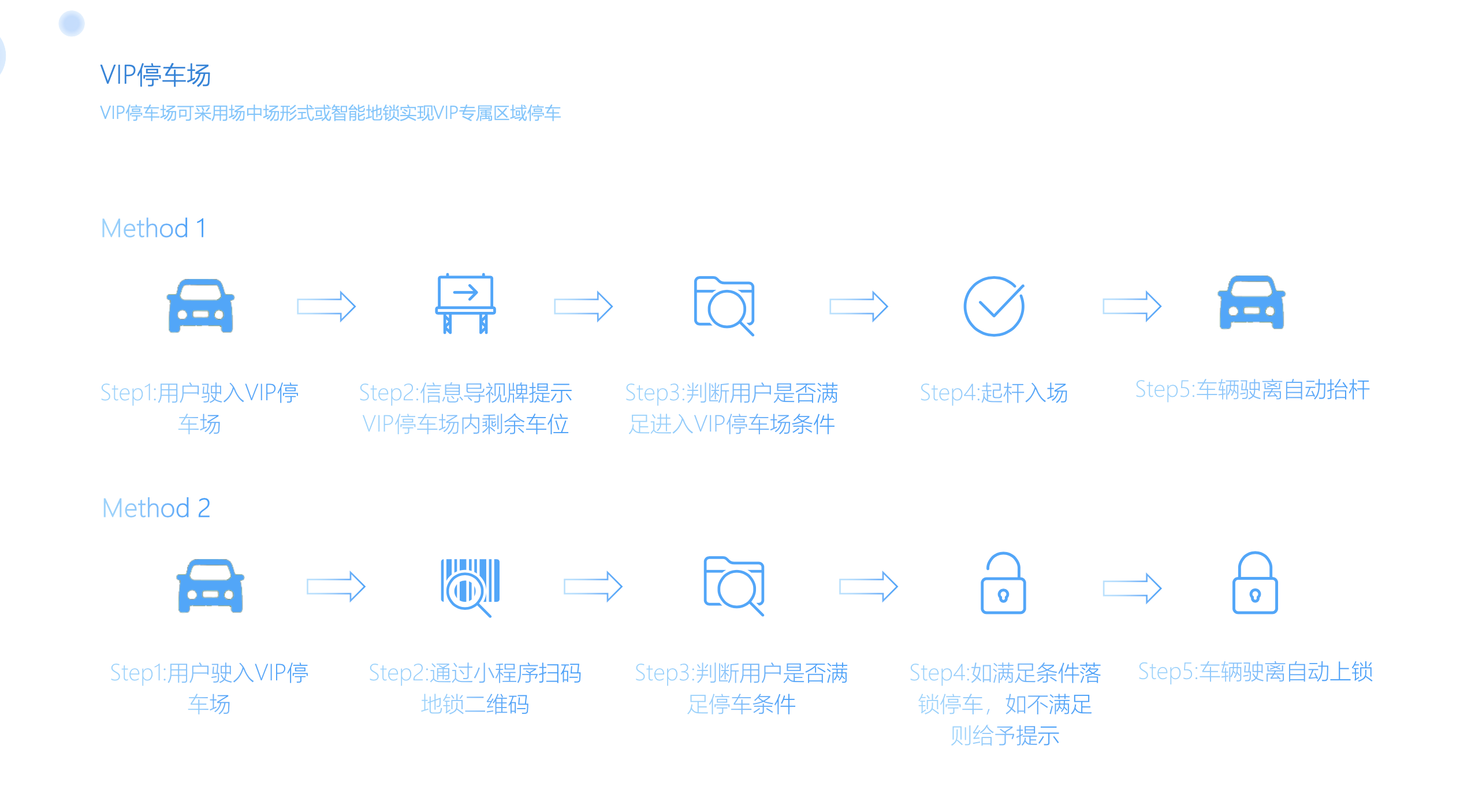 VIP停车场可采用场中场形式或智能地锁实现VIP专属区域停车。