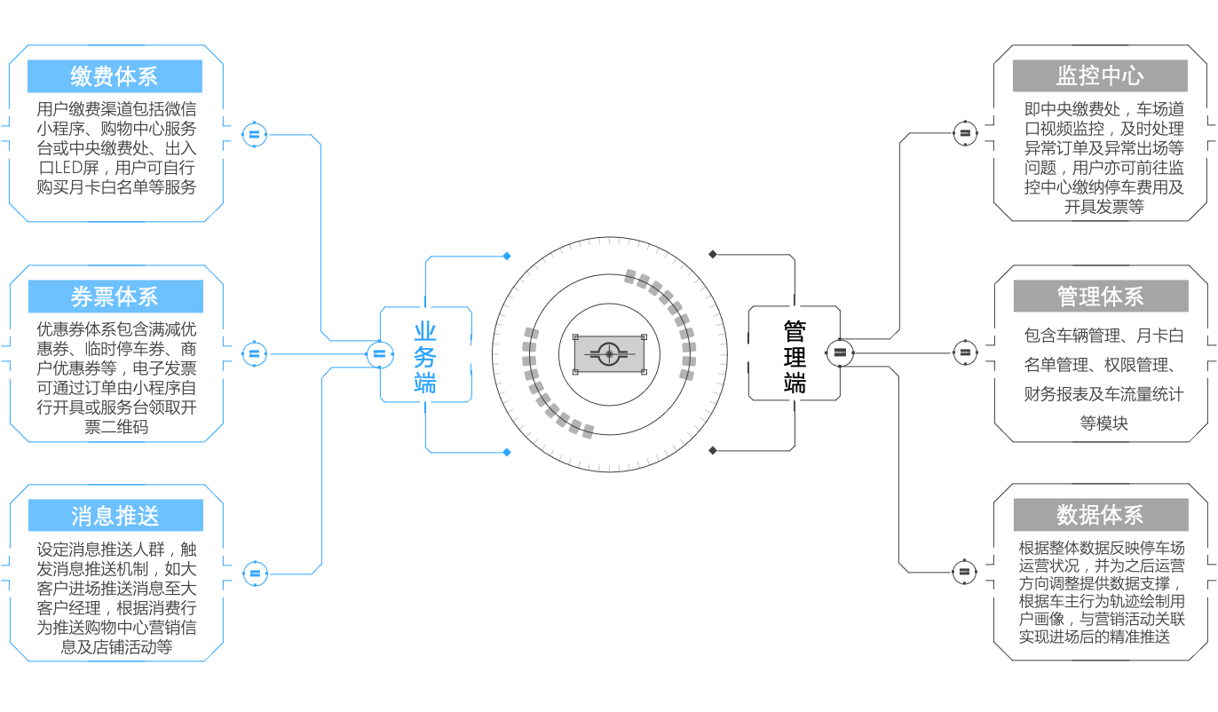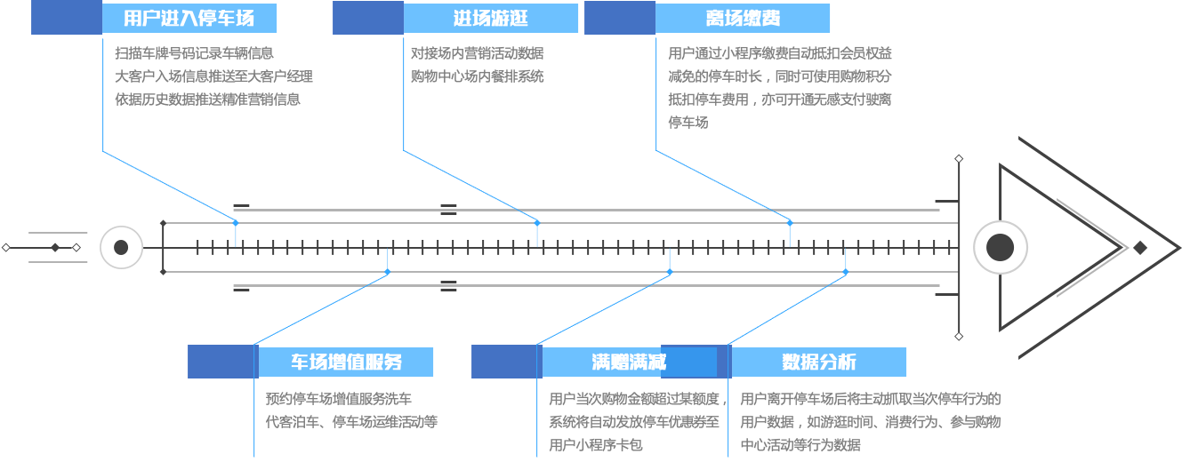 围绕提升运营效率、降低管理成本、提升用户体验及简化管理流程构建商业地产智慧停车体系通过打通购物中心会员体系、收银体系及营销活动体系等构建停车场辅助营销体系。