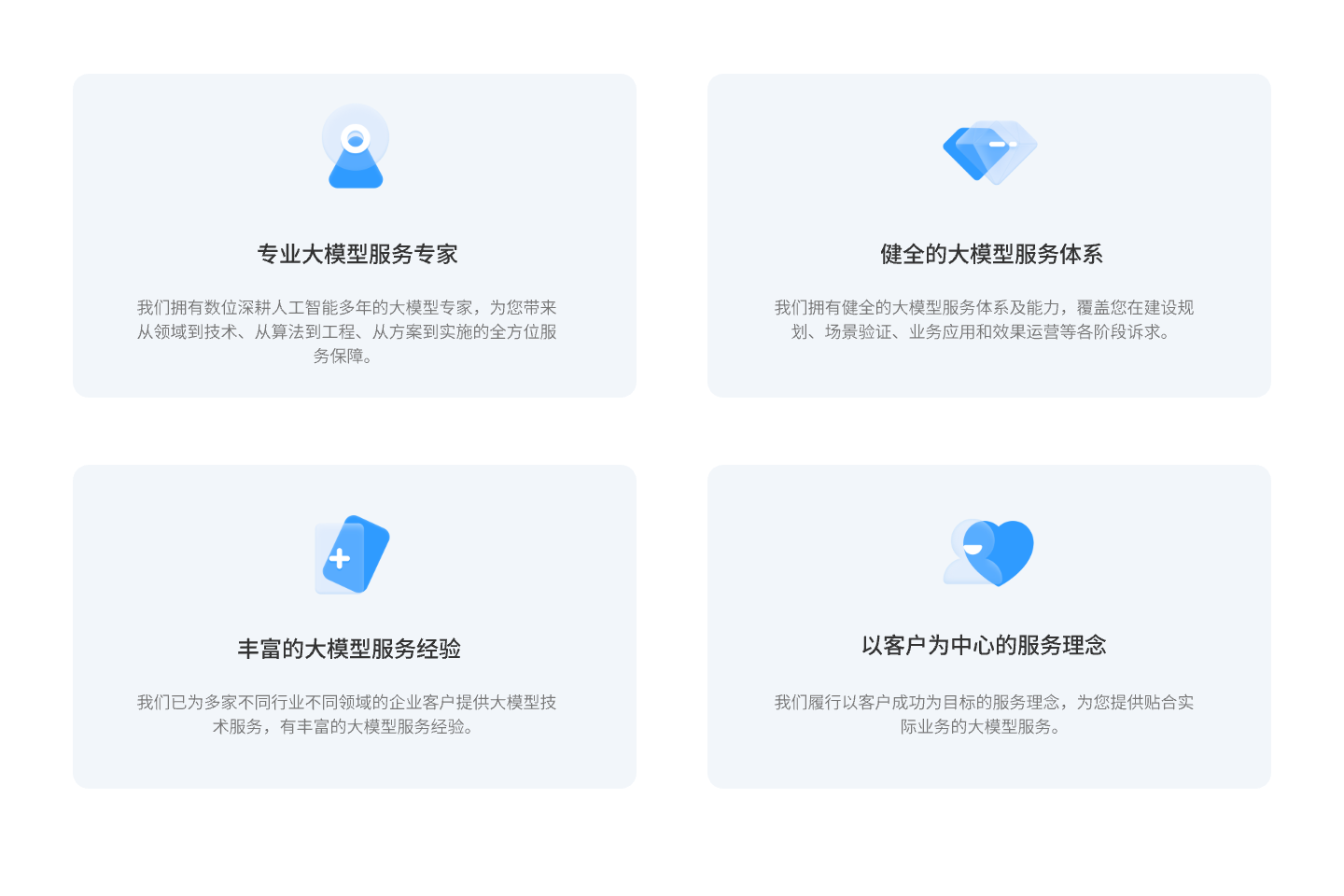 我司大模型服务团队,在通用人工智能大模型突破传统AI技术的时代契机下,提供了自顶向下的从技术选型、解决方案架构,到平台工具使用、模型效果调优等一套可闭环的咨询服务链。我们与深耕行业场景的客户研发团队一起,打造了传统AI技术不具备的智能化产品新形态。